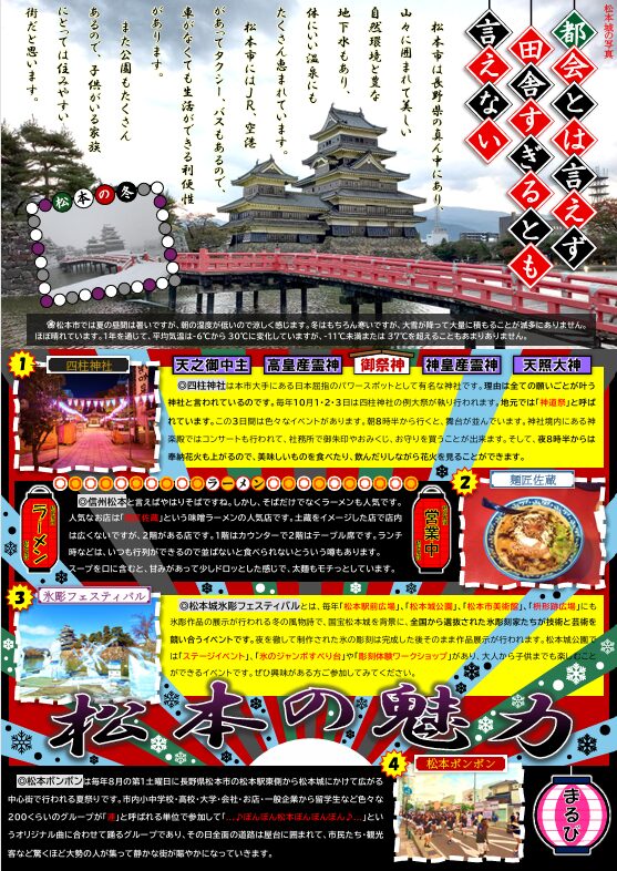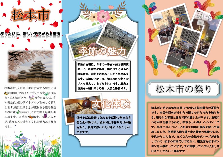 「地元の特色」というテーマを通して、松本市で暮らす留学生の目線から松本の魅力を情報発信することができました。